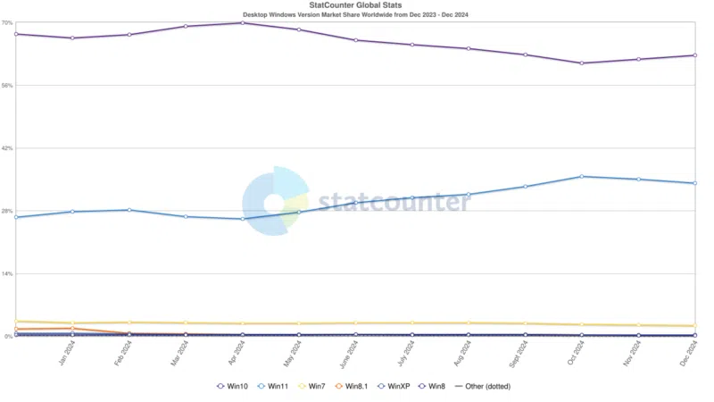 L'éditeur ESET, spécialisé dans la cybersécurité, a publié un nouvel article de blog pour alerter sur les risques liés à la fin du support de Windows 10, prévue pour octobre 2025. Cet article évoque un fiasco sécuritaire pour 2025 : ce qui est compréhensible puisqu'au niveau mondial, Windows 10 serait encore utilisé par 62.73% des machines sous Windows. Il y a même eu une progression de Windows 10, en comparaison de Windows 11, entre novembre 2024 et décembre 2024. Ceci est parfaitement visible sur ce graphe obtenu à partir du site StatCounter.
