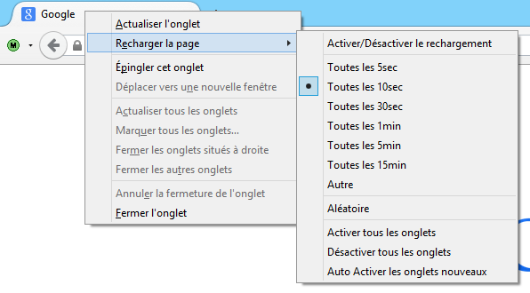 Vous pouvez activer ou désactiver le rechargement automatique en cliquant sur "Activer/Désactiver le rechargement", de la même manière que vous pouvez l'activer ou désactiver pour tous les onglets ouverts (options : Activer tous les onglets / Désactiver tous les onglets).