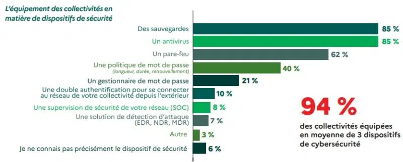 La réponse est "Oui" majoritairement : "Les collectivités affirment à 94 % être dotées de 3 outils en moyenne; 3 outils en moyenne pour les plus petites et près de 5 pour les collectivités de plus de 5000 habitants.", avec les sauvegardes, l'anti-virus et les pare-feux comme trio de tête. Finalement, ce n'est pas une surprise, car c'est "la base" dans une infrastructure informatique. Nous aimerions avoir des pourcentages plus élevés sur la double authentification, l'utilisation d'un gestionnaire de mots de passe ou encore l'utilisation d'une solution de protection plus évoluée.