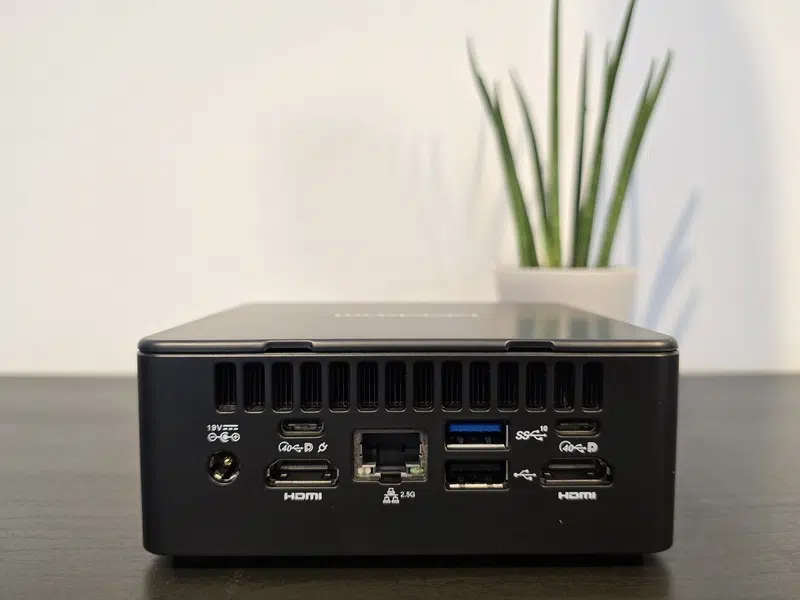 - Connectique : 1 x USB-A 3.2 Gen 2 (livraison d'énergie S5), 1 x USB-A 2.0, 2 x USB-A 3.2, 2 x USB-C 4.0 (dont 1 avec l'alimentation PD), 1 x Prise casque stéréo 3,5 mm, 1 x RJ45 2.5 GbE, 2 x HDMI 2.0, 1 x alimentation DC, 1 x verrou Kensington, 1 x lecteur de carte SD 4.0