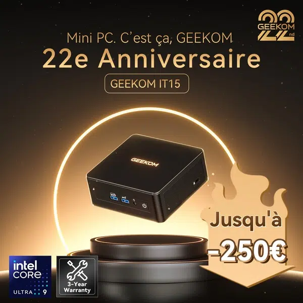 Geekom, la célèbre marque de mini PC, fête son 22ème anniversaire ! L'occasion de revenir sur la réussite de Geekom et de célébrer cet événement par une offre spéciale sur le mini PC Geekom IT15.