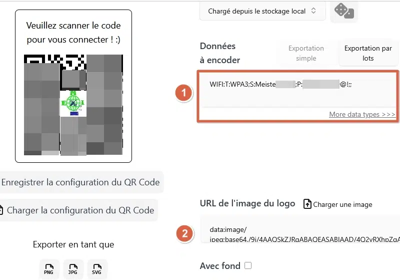 - Soit on va directement renseigner les informations suivantes dans la case des données à encoder : WIFI: pour préciser qu'il s'agit des informations de connexion à un réseau, T: pour indiquer le type de sécurisation, S: pour le SSID, P: pour la clé de chiffrement et deux points-virgules pour clôturer.