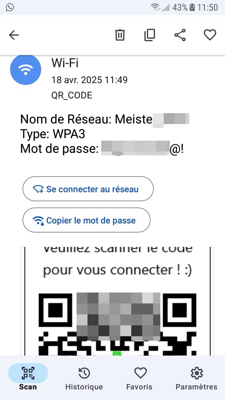 On enregistre le code généré. Si on va le scanner, on devrait logiquement retrouver les informations de connexion à notre WLAN.