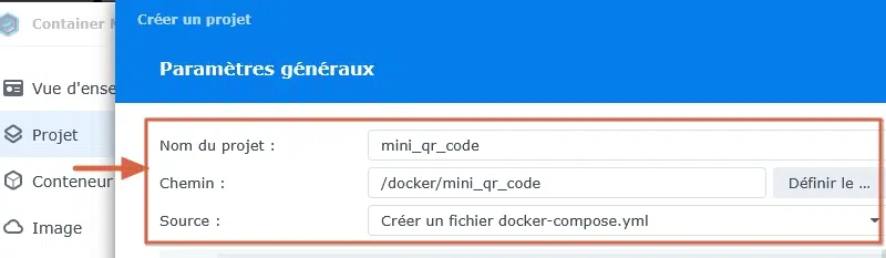 Une fois le répertoire créé, on se rend dans Container Manager. On va créer un nouveau projet qu'on appellera mini_qr_code. On le place dans le dossier mini_qr_code précédemment créé et on choisit d'éditer un nouveau fichier docker-compose.