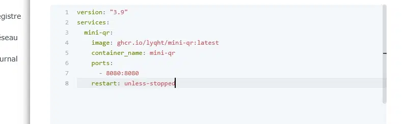 Le fichier docker-compose qu'on peut retrouver sur le GitHub de Mini QR Code Generator, qui n'est pas volumineux ici, contiendra les directives suivantes :