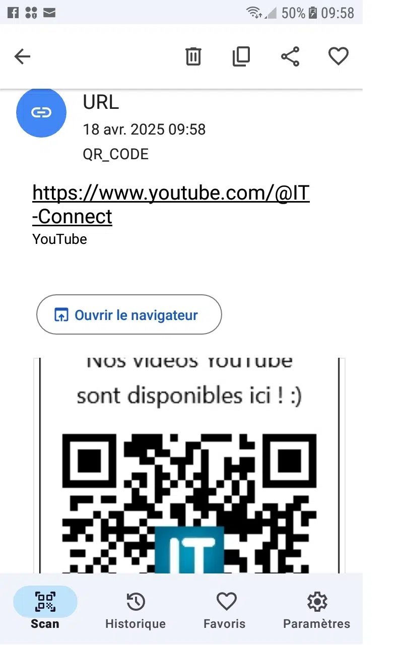 Si on scanne l'image à l'aide un smartphone (ou avec le bouton "Analyser" de Mini QR Code Generator), on devrait pouvoir retrouver notre lien. On a même la possibilité de le copier, de le partager ou de cliquer dessus pour aller visualiser le contenu de la chaine YouTube.