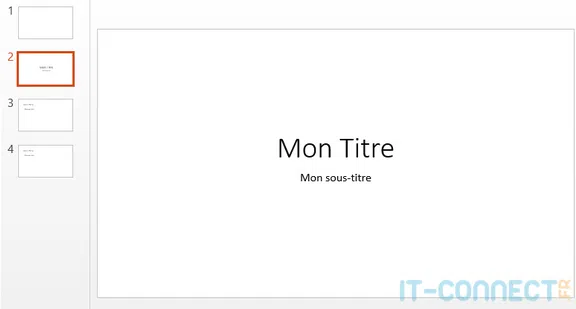 En résultat, nous obtenons bien une slide "Titre" (ID 0) et deux slides “Titres et contenu” (ID 1). Il est important de retenir que les slides sont créées de manière séquentielle, les unes à la suite des autres. Il est possible avec python-pptx de manipuler l’ordre des slides, mais faisons simple pour ce tutoriel d’introduction.