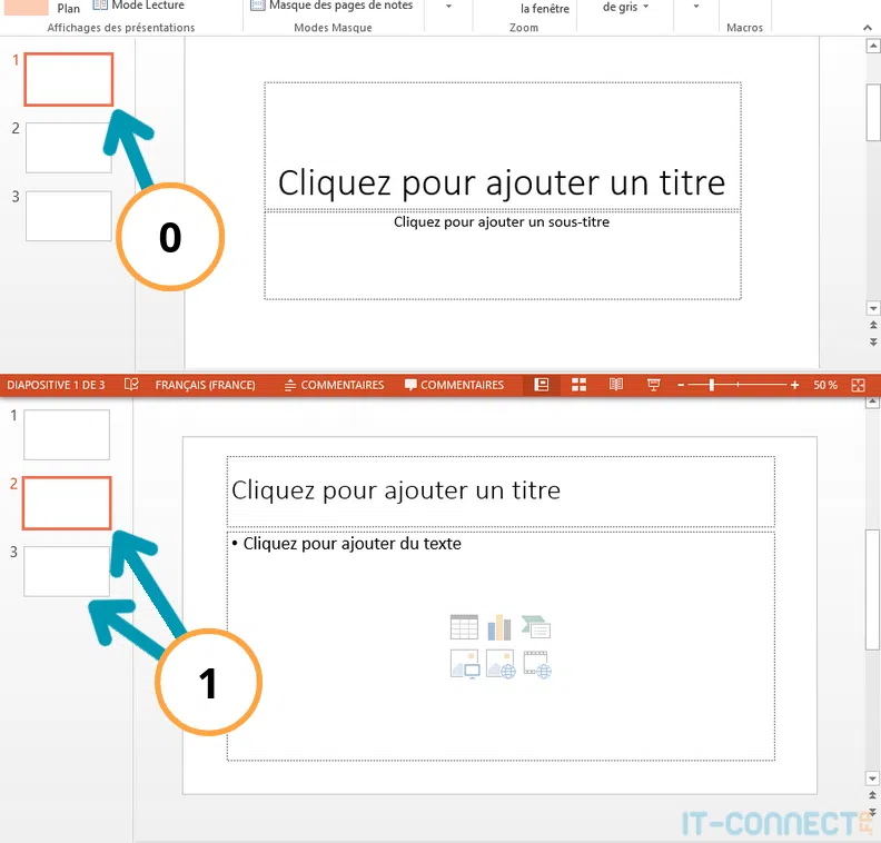 Vous pouvez voir dans la diapositive qui vient d’être créée deux rectangles en pointillé contenant "Cliquez pour ajouter [...]". C’est ce que l’on nomme des placeholders (espaces réservés). Il s’agit de zones définies, pouvant être colorées ou mises en forme, qui contiendront vos différents éléments (image, graphique, texte, ou autre). Encore une fois, vous pouvez créer les vôtres facilement. Il faut pour cela se rendre dans "Affichage" puis "Masque de Diapositive".