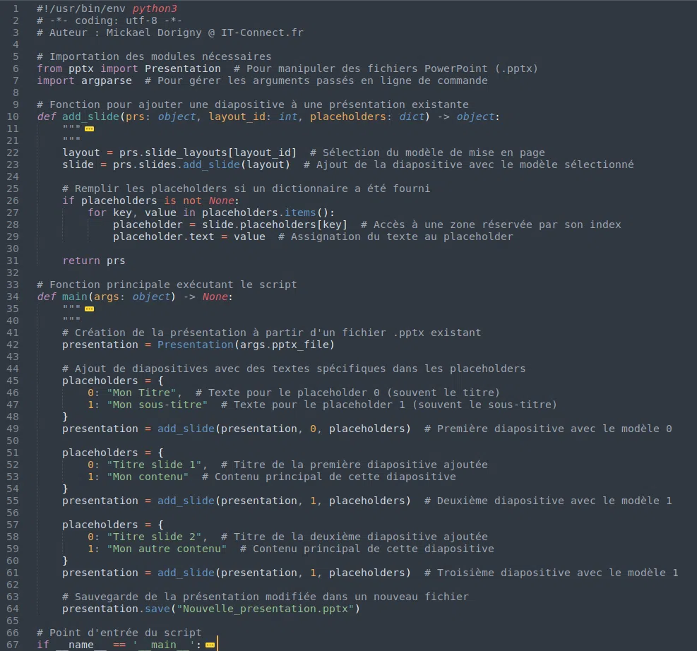 On peut voir en ligne 45-47, 51-54 et 57-69 leur définition, avant chaque ajout de slide pour que la slide créée le soit avec le contenu souhaité. Les lignes 26 à 29 permettent de parcourir toutes les clés du dictionnaire reçu et d’ajouter une à une les valeurs dans les bons placeholders.