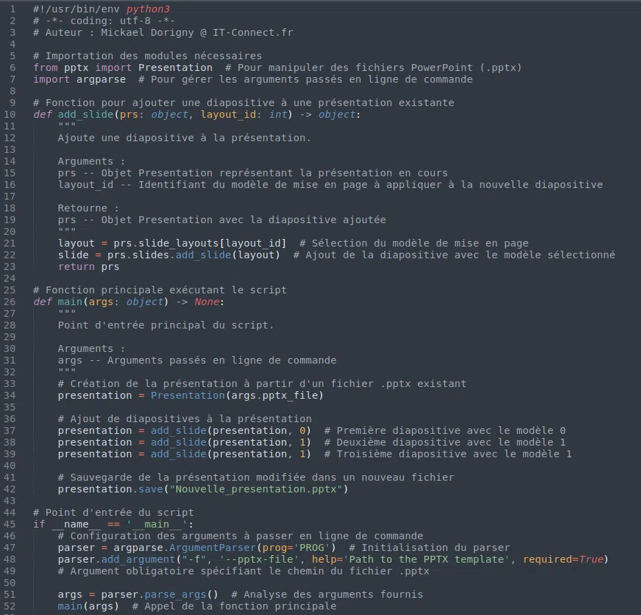 La ligne n°34 permet de créer un objet de type "Presentation" (vient de python-pptx) à partir du modèle renseigné en paramètre "-f" (le fichier PPTX contenant nos layouts et placeholders).