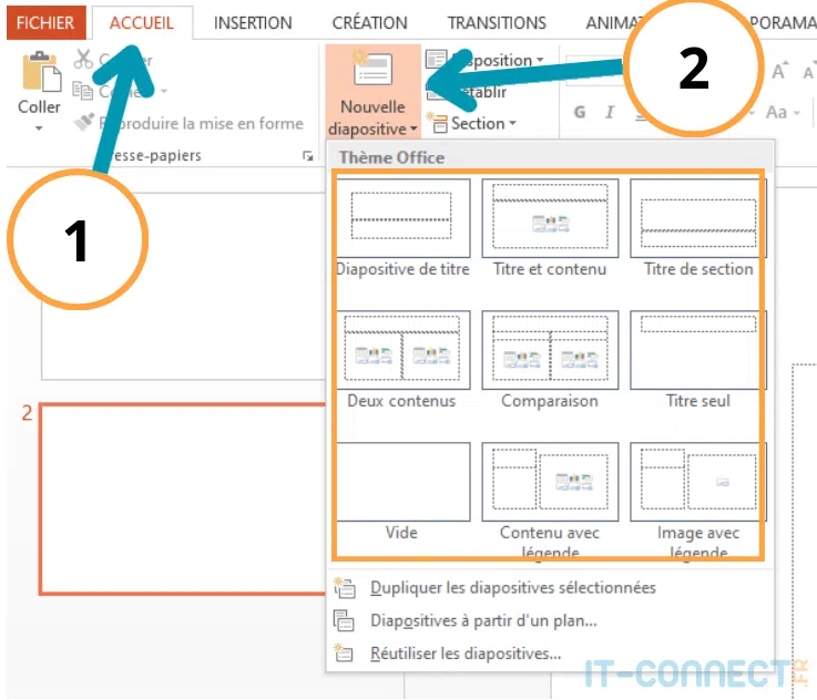 Les présentations et fichier PowerPoint peuvent contenir des modèles de présentation, c'est-à-dire des diapositives pré-enregistrées pouvant être réutilisées rapidement. Au sein d’un fichier existant, vous pourrez retrouver ces mises en page (aussi appelées layout) en vous rendant dans "ACCUEIL" puis "Nouvelle Diapositive" :