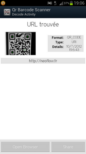 Je l'ai ensuite scanné avec l'application Android "Qr Barcode Scanner" fraîchement installée sur mon smartphone et cela m'a donné le résultat suivant :