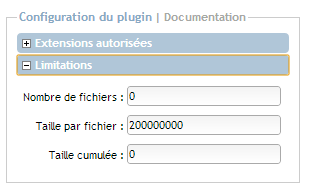Dans "Limitations" On pourra alors fixer la taille par fichier à 200Mo (ou 200000000 octets), la limite en nombre de fichier peut alors être mise à 50 comme dans le paramétrage php5 ou à 0 (qui veut dire illimité) auquel cas c'est le fichier php5 qui fixera à nouveau la limite.
