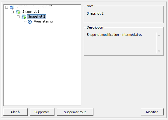 On va alors revenir à l’état initial et les modifications faites depuis la prise du snapshot auquel nous sommes revenus ne seront plus effective, on pourra alors sélectionner à nouveau notre SnapShot dans le gestionnaire et faire « Supprimer » si notre Snapshot n'est plus utile.