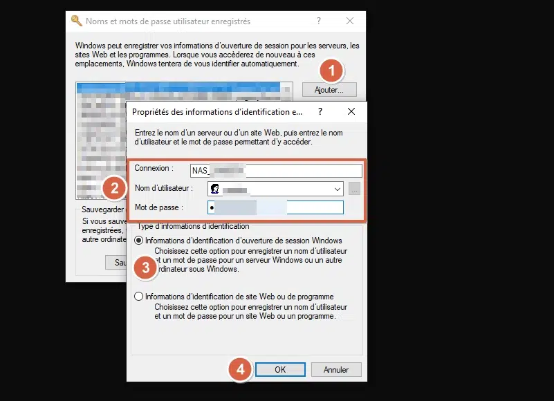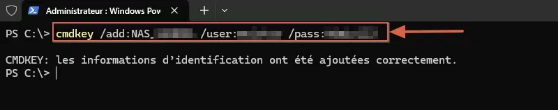 cmdkey /add:mon_nas /user:mon_utilisateur /pass:mon_mot_de_passe