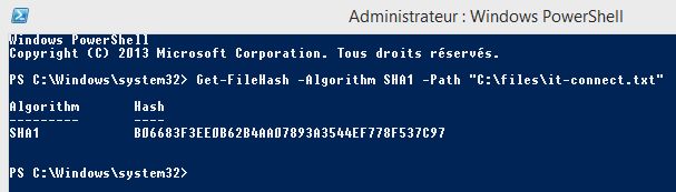 Ouvrez une console pour essayer la commande. Par exemple, pour calculer le hash SHA1 du fichier "it-connect.txt" situé dans "C:\files\" :