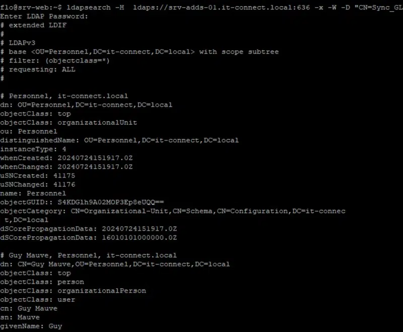 ldapsearch -H ldaps://srv-adds-01.it-connect.local:636 -x -W -d1 -D "CN=Sync_GLPI,OU=Connecteurs,DC=it-connect,DC=local" -b "OU=Personnel,DC=it-connect,DC=local"