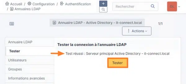 Dès que la configuration est effectuée, sauvegardez et cliquez sur "Tester" sur la gauche. Puis, une nouvelle fois sur le bouton "Tester" afin d'établir un test de connexion. Si cela ne fonctionne pas, redémarrez le serveur GLPI : c'est ce que j'ai eu à faire pour ma part, car un reload du serveur Apache2 n'a pas suffi. Ensuite, testez de nouveau.