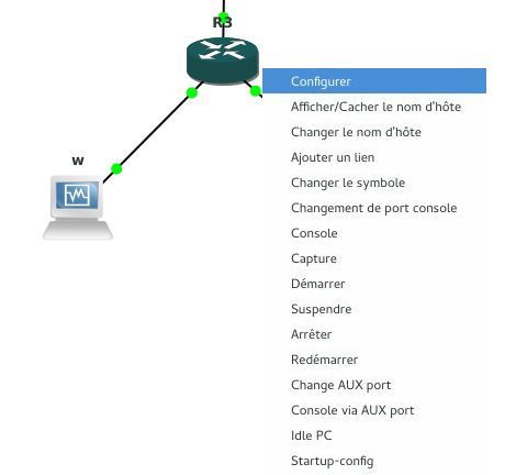 Avant de commencer une quelconque configuration, il faut commencer par ajouter le module "Switch" à notre routeur. En effet, par défaut un routeur ne possède que 2 à 4 ports, ce qui ne nous permet pas forcément de le faire passer pour un switch dans le cadre d'un port mirroring. Nous allons donc faire un clic droit sur notre routeur pour aller dans le menu "Configuration" :