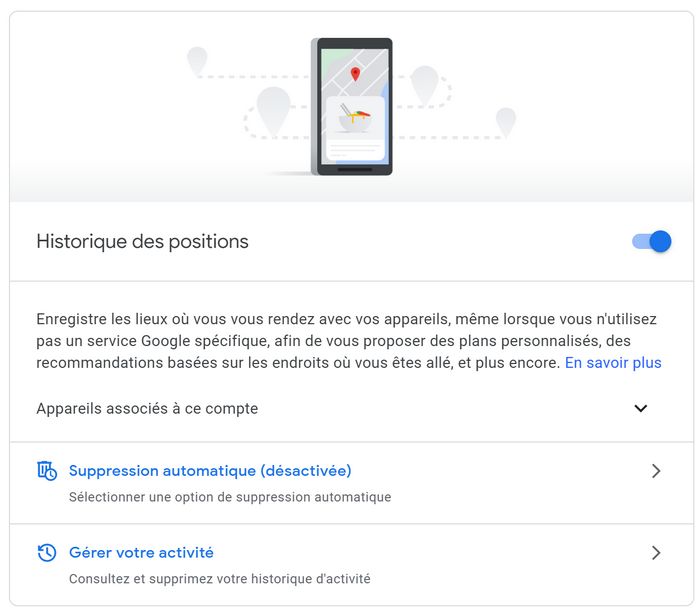 Sur la page "Commandes relatives à l'activité" (via le lien ci-dessus), il est possible de gérer son activité pour le web et les applications, pour les positions (géolocalisation), ainsi que YouTube.