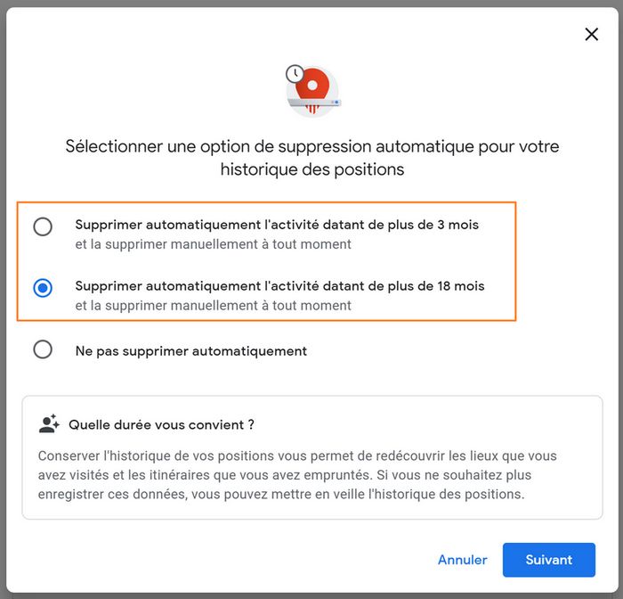 Ce choix s'applique également pour vos activités futures, et dès qu'une activité aura plus de 3/18 mois, elle sera automatiquement supprimée de votre historique.