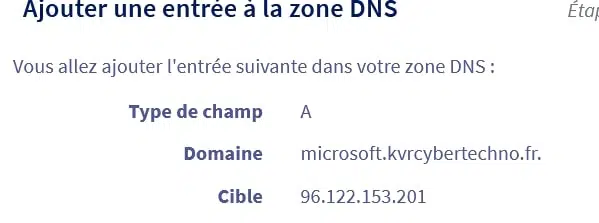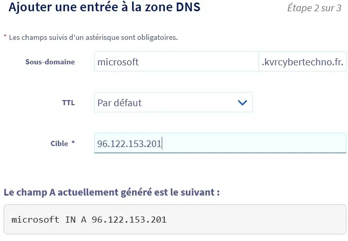 Depuis votre hébergeur (l'enregistrement pour OVHcloud se fait via cette URL), vous allez créer un nouvel enregistrement DNS pour votre "phish_server". Utilisez un champ de pointage de type « A » et un nom de sous-domaine crédible pour piéger vos utilisateurs ; ici, ce sera « microsoft.kvrcybertechno.fr ». Dans la section « Cible », indiquez l'adresse de l'interface WAN de votre pfSense si vous en utilisez un, ou l'adresse IP du serveur hébergeant votre DNS forwarder, qui est « 96.122.153.201 ».