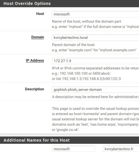 Dans la section "Host Overrides", vous devez ajouter deux entrées. Voici l'exemple de configuration pour le "phish_server" :