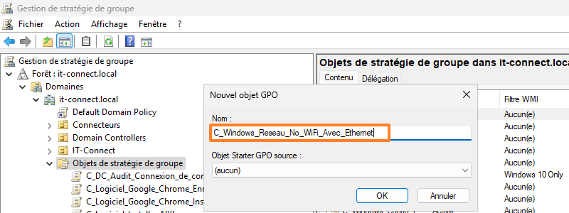 Créez une nouvelle stratégie de groupe, que vous pouvez nommer comme bon vous semble. Par exemple : C_Windows_Reseau_No_WiFi_Avec_Ethernet. J'ai l'habitude d'ajouter le préfixe C_ pour les GPO qui ciblent les ordinateurs (Computers).