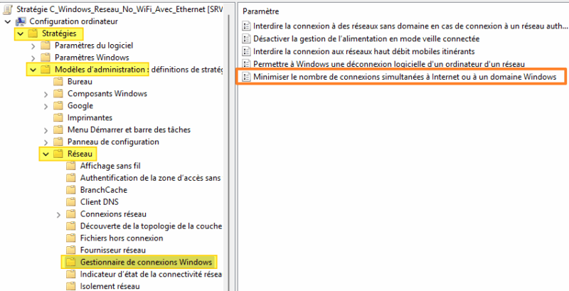 - Configuration ordinateur > Stratégies > Modèles d’administration > Réseau > Gestionnaire de connexions Windows