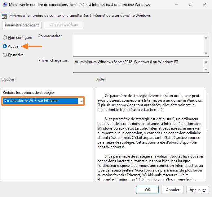 Double-cliquez sur le paramètre en question, basculez son statut sur "Activé" et dans les options, sélectionnez la valeur "3 = interdire le Wi-Fi sur Ethernet". Ce choix va permettre d'obtenir le résultat attendu, à savoir interdire les connexions Wi-Fi si une connexion Ethernet (filaire) est active.