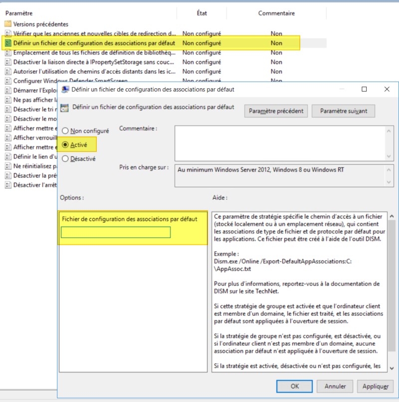 Il est nécessaire de l'activer bien entendu, mais également d'ajouter le chemin vers le fichier .XML dans le champ "Fichier de configuration des associations par défaut". A titre d'exemple, cela pourrait être un chemin réseau sous la forme : \\mon-serveur\partage\chrome.xml