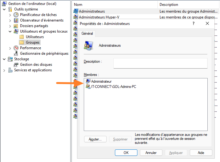 - Ajouter au groupe "GDL-Admins-PC" le(s) utilisateur(s) qui doivent pouvoir administrer les machines (par exemple, un technicien de support informatique).