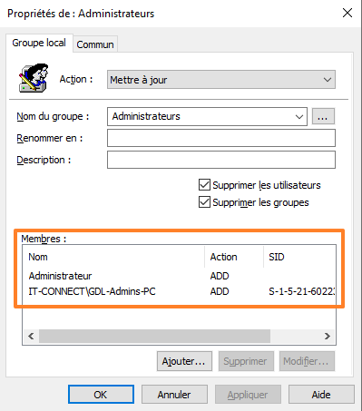 - Définir ce groupe de sécurité en tant que membre du groupe "Administrateurs" de l'ensemble des machines Windows du parc informatique.