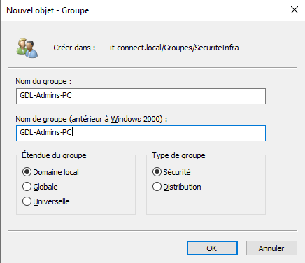 - Créer un groupe de sécurité Active Directory nommé "GDL-Admins-PC".