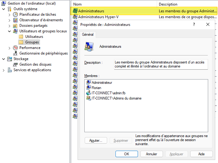 Et là, si l'on regarde le contenu du groupe "Administrateurs", on peut voir qu'il a évolué ! Il est le reflet de la configuration définie par GPO.