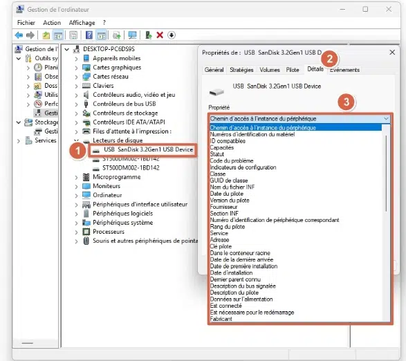 Pour lister les périphériques autorisés à s’installer sur notre PC, il faut d’abord brancher les périphériques en question (ici la clé SanDisk). C’est ainsi qu’on va aller récupérer son ID d’instance de périphérique depuis le Gestionnaire de périphériques.
