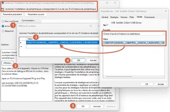 Une fois ouvert, on sélectionne Activé. On clique ensuite sur Afficher. Une nouvelle fenêtre s’ouvre. Dans la section Valeur, on rentre la valeur de l’ID d’instance de périphérique correspondant à la clé SanDisk et on sauvegarde le tout.