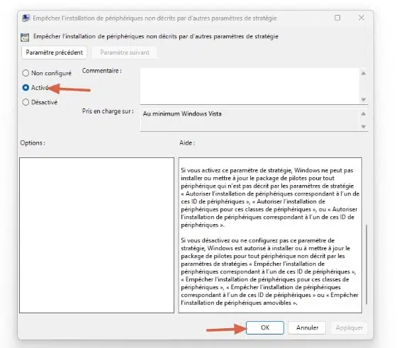 Plusieurs stratégies de groupe peuvent nous aider dans ce sens, mais on ira plutôt éditer celle-ci : Autoriser l’installation des périphériques correspondant à l’un de ces ID d’instance de périphériques.