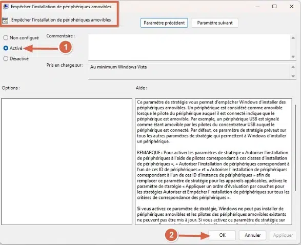 Après avoir listé les périphériques autorisés à se connecter au système, il faut dorénavant penser à interdire l’accès à tout autre périphérique. La stratégie de groupe la plus appropriée est la suivante : Empêcher l’installation des périphériques non décrits par d’autres paramètres de stratégies. Il suffit de l’activer et de sauvegarder le tout.