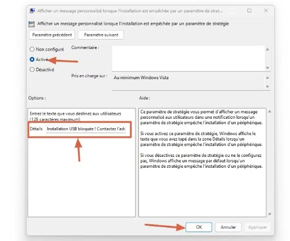 Pour cela, il suffit d’aller l’activer, d’insérer un petit message personnalisé de 128 caractères maximum et de sauvegarder le tout. Notre petit message personnalisé ici sera alors « Installation USB bloquée ! Contactez l’administrateur ! ».
