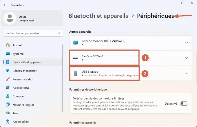 Si on se rend, par exemple, ensuite dans Paramètres, puis Bluetooth et appareils et enfin sur Périphériques, on peut bien lire dans la section Autres appareils que l’installation de la nouvelle clé est bloquée par la stratégie de groupe.