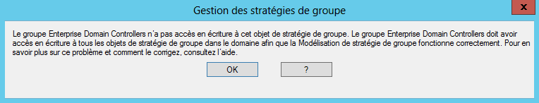 Lors d’une migration de domaine de Windows 2000 vers une version plus récente notamment Windows Server 2008, 2008 R2 et même 2012, il se peut que le message suivant soit obtenu lorsqu’on clique sur un objet GPO dans la console d’édition des stratégies de groupe : « Le groupe Enterprise Domain Controllers n’a pas accès en écriture à cet objet de stratégie de groupe…. ».