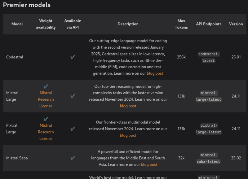 La liste des modèles disponibles est accessible sur cette page de la documentation : docs.mistral.ai/getting-started/models/models_overview/