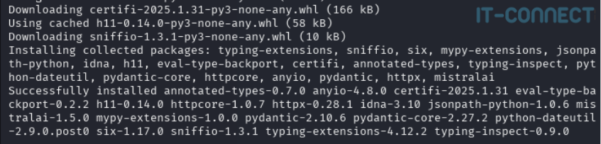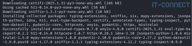 À présent, nous devons installer le module nommé mistralai, je vais passer par un environnement Python virtuel afin de respecter les bonnes pratiques :