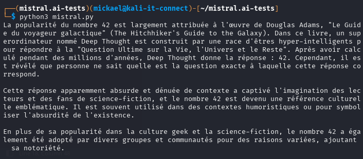 En quelques lignes, nous parvenons à envoyer notre prompt aux services Mistral AI via leur API, puis à récupérer une réponse. Cela ouvre la possibilité à de très nombreux cas d’usage et d’automatisation, bien plus avancé que via une interface web !