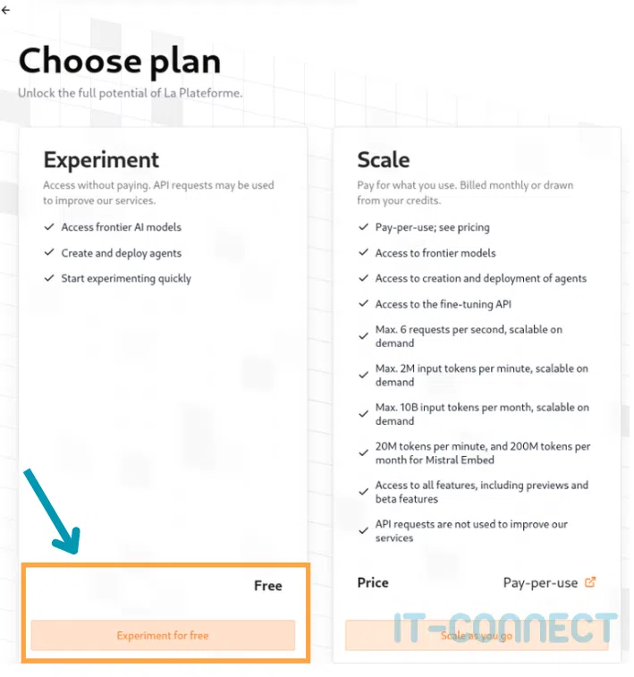 Vous arriverez ensuite sur la page console.mistral.ai/upgrade/plans et pourrez choisir le plan gratuit “Experiment” :