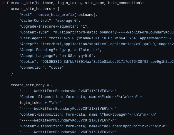 Cette vulnérabilité repose sur une manipulation des caractères en majuscule dans les balises PHP injectées (par exemple, "<?PHP" au lieu de "<?php"), précisément dans le module "Websites". L'exploit que j'utilise commence donc par s'authentifier, puis créer un site web :