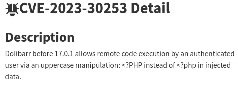 Plusieurs exploits publics existent, dont celui-ci : Github - CVE-2023-30253. La CVE-2023-30253 concerne une vulnérabilité dans Dolibarr < 17.0.1 qui permet l'exécution de code à distance par un utilisateur authentifié.
