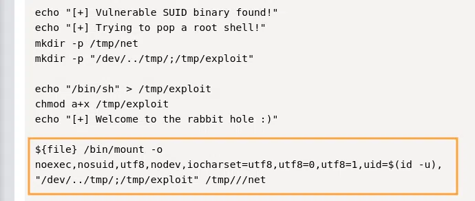 Cette vulnérabilité permet d'élever ses privilèges en exploitant une erreur d'interprétation dans le chemin fourni en argument au binaire. Ainsi, au lieu de profiter des droits "root" uniquement pour les opérations réalisées par le binaire, il est possible de contrôler son exécution pour lui faire exécuter d'autres commandes. À nouveau, plusieurs PoC (Proof of Concept) sont disponibles sur Exploit-DB ou Github, intéressons-nous à leur contenu : https://www.exploit-db.com/exploits/51180