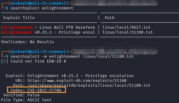 Une fois ce vhost découvert, la recherche des identifiants par défaut et des CVE impactant les versions ou binaires découvertes visait à vous entrainer à ces deux phases importantes. Utiliser les bonnes ressources et les bons outils de recherche peut grandement vous faciliter la tâche. Searchsploit aurait par exemple, pu faciliter l'identification de la CVE-2022-37706 :